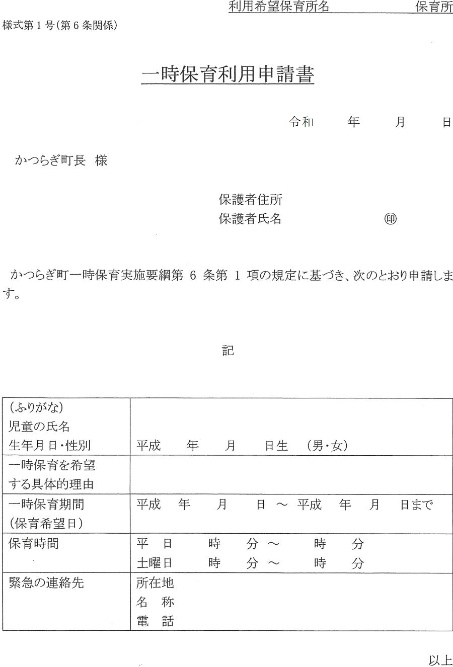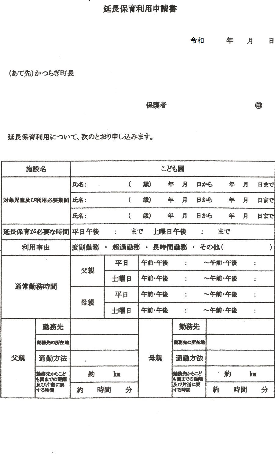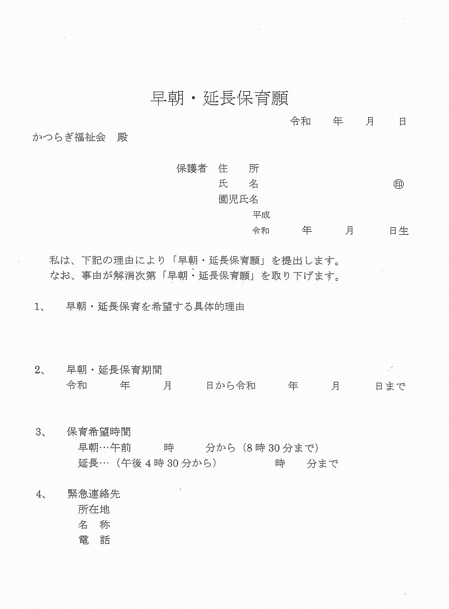 利用となっています。ご利用される方は、園に早朝延長保育願を提出し役場の了解を得てからのご利用となります。