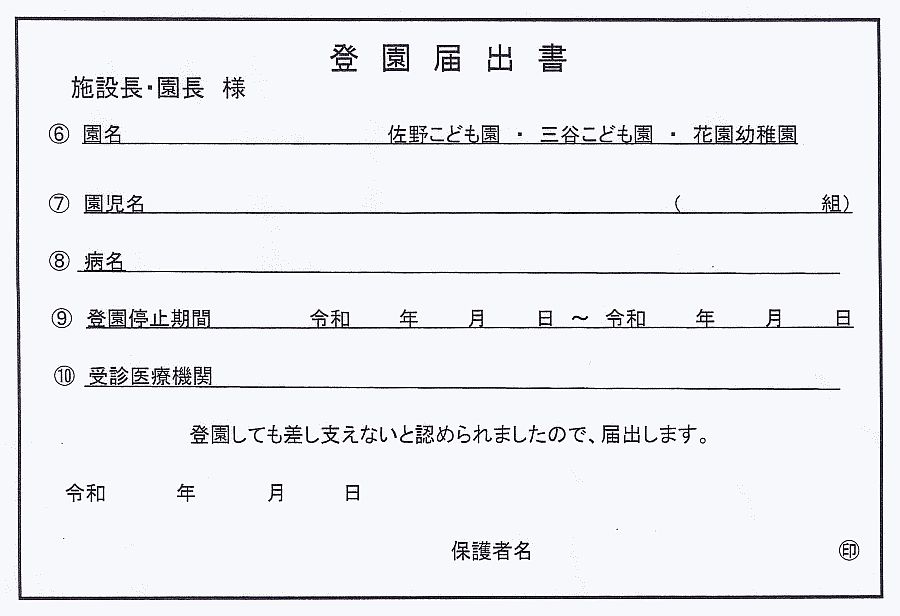 感染症と診断された場合、「登園の目安」を基準に医師の診断に従い、「登園届出書」の提出をお願いします。尚、園での集団生活に適応できる状態に回復してから登園するようお願いします。