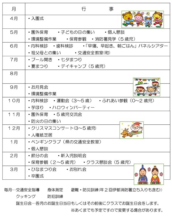 また、子ども達が集団生活の中で安全に、伸び伸びと活動ができるように、環境を整え、保育士が適切にかかわりながら、一人一人の子どもの自主性、 自発性を大切にする子どもを主体とした総合的な保育・教育をしています。