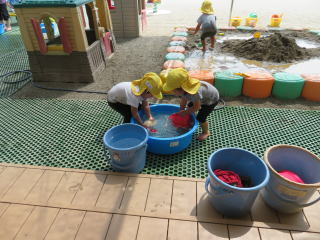 1,2歳の夏のあそびを満喫した様子です。水あそび・感触あそび、みんなみんな楽しいね♪