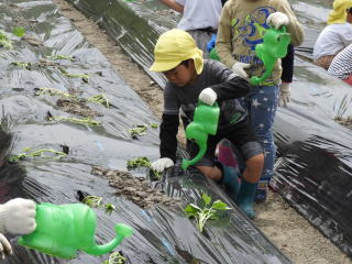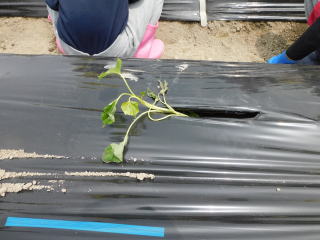 「苗植えって初めて~」と興味津々で植え方を聞いています。